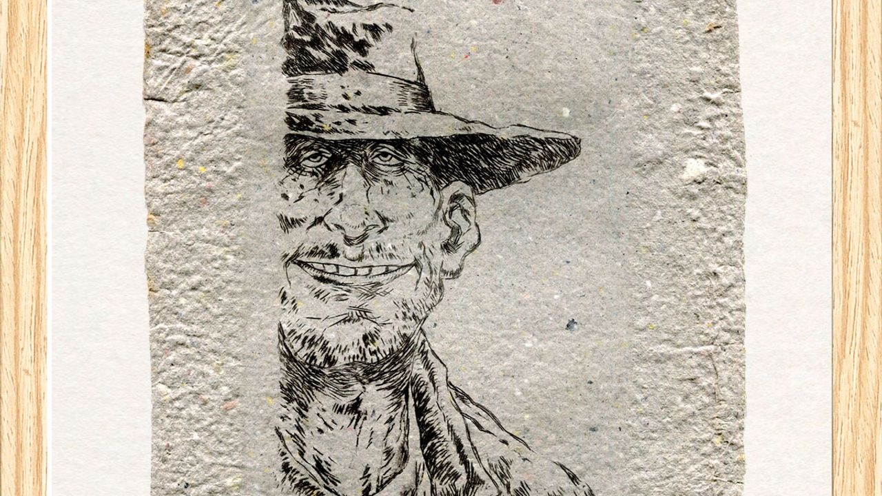2 couleurs (bleu et vert bouteille) sur papier beige 250 g/m², format paysage, 30 cm sur 40 cm.